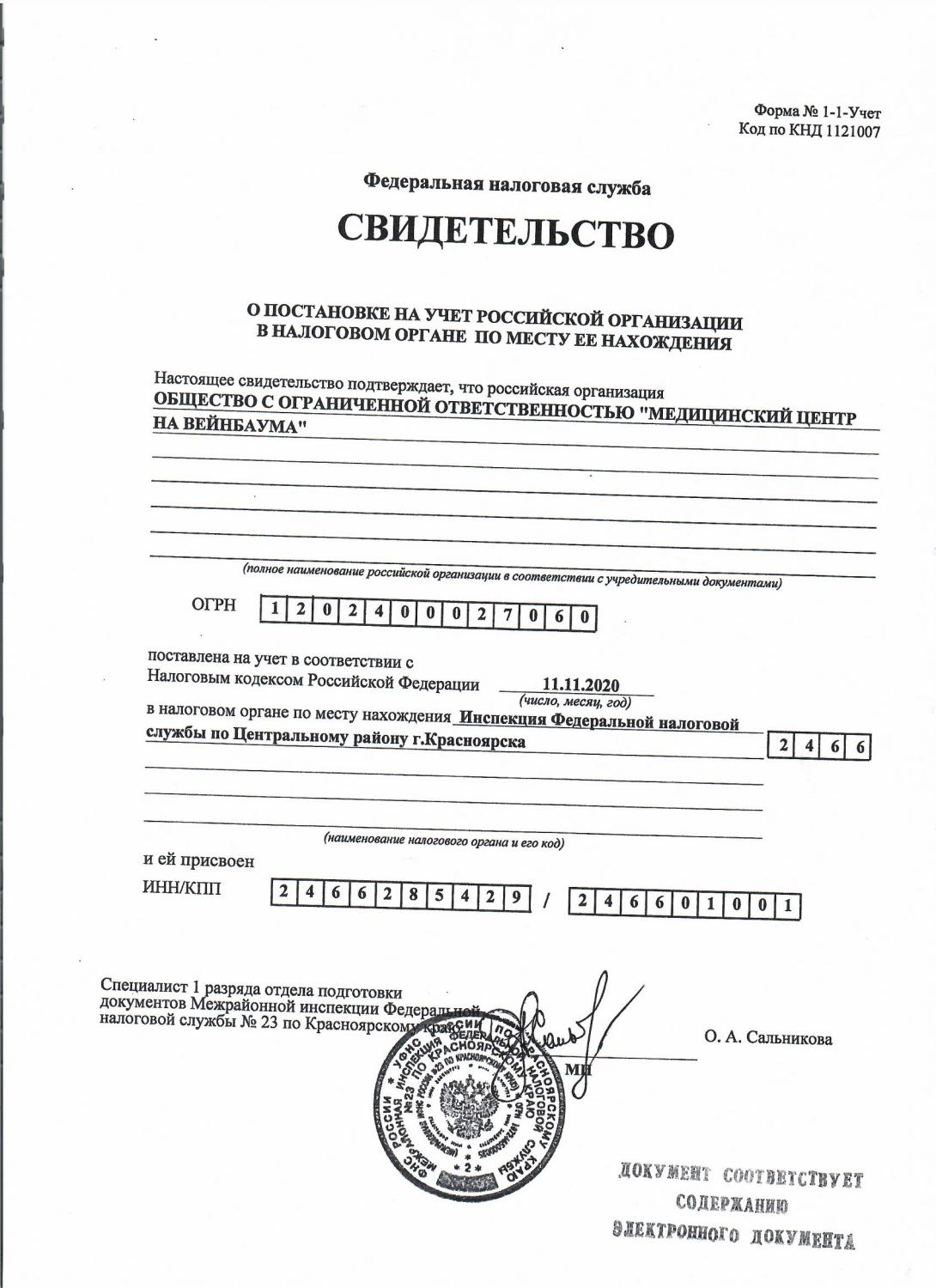 Свидетельство о постановке на учет российской организации в налоговом органе по месту ее нахождения